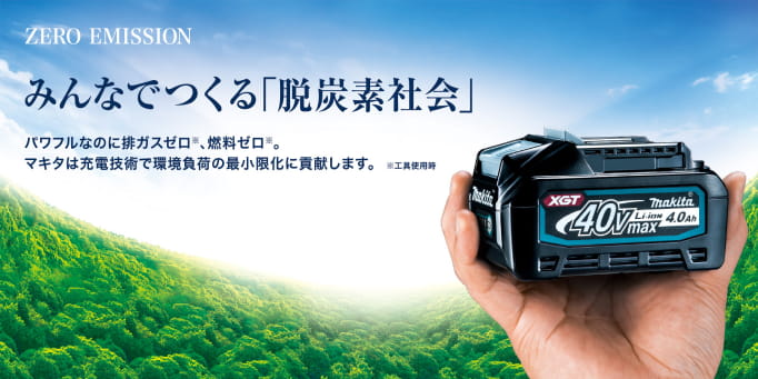 2005年、当社は業界に先駆けてリチウムイオンバッテリを搭載したインパクトドライバの販売を開始しました。その後も次々とリチウムイオンバッテリ製品を発表し、そのラインアップは業界随一のものとなっています。近年では電動工具だけでなく、集じん機や園芸用機器でもリチウムイオンバッテリを採用した製品の拡充が進んでいます。また、昨今の自然環境や作業環境に対する意識の高まりから、排出ガス、騒音・振動対策が重視されるようになっています。当社はこれに応えるため、充電式工具でありながら、エンジン式に匹敵するパワーを有し「排ガスを出さない」※「燃料を必要としない」※「始動時の手間がない」そして「圧倒的に低騒音」を追求し、環境との調和を目指しています。