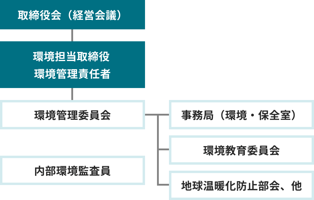 当社は、環境保全活動を経営の重点課題のひとつとして捉え、下図の体制で環境マネジメントを推進しています。環境保全活動に関する審議決定機関としては「環境管理委員会」を設置し、環境担当取締役(環境管理責任者)が統括しています。また、「環境管理委員会」の下には、1つの委員会と5つの環境保全活動を推進する部会を設置し、具体的な環境活動を推進しています。