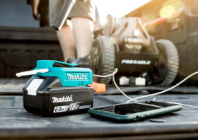 気候変動などの影響を受けて、近年多発する台風などの自然災害。災害時には大規模な停電が発生する場合もあり、ライフラインの復旧に時間がかかることも考えられます。そのような電源確保ができない環境に役立つのがマキタのバッテリ。充電式クリーナなどで使用されるバッテリで、ラジオやライトをはじめとした数多くの防災製品を利用できます。また、当社専用のUSBアダプタを使用すれば、バッテリからスマートフォンへの充電も可能であり、災害時の情報収集や連絡手段に困ることなく、お客さまに安心を提供します。